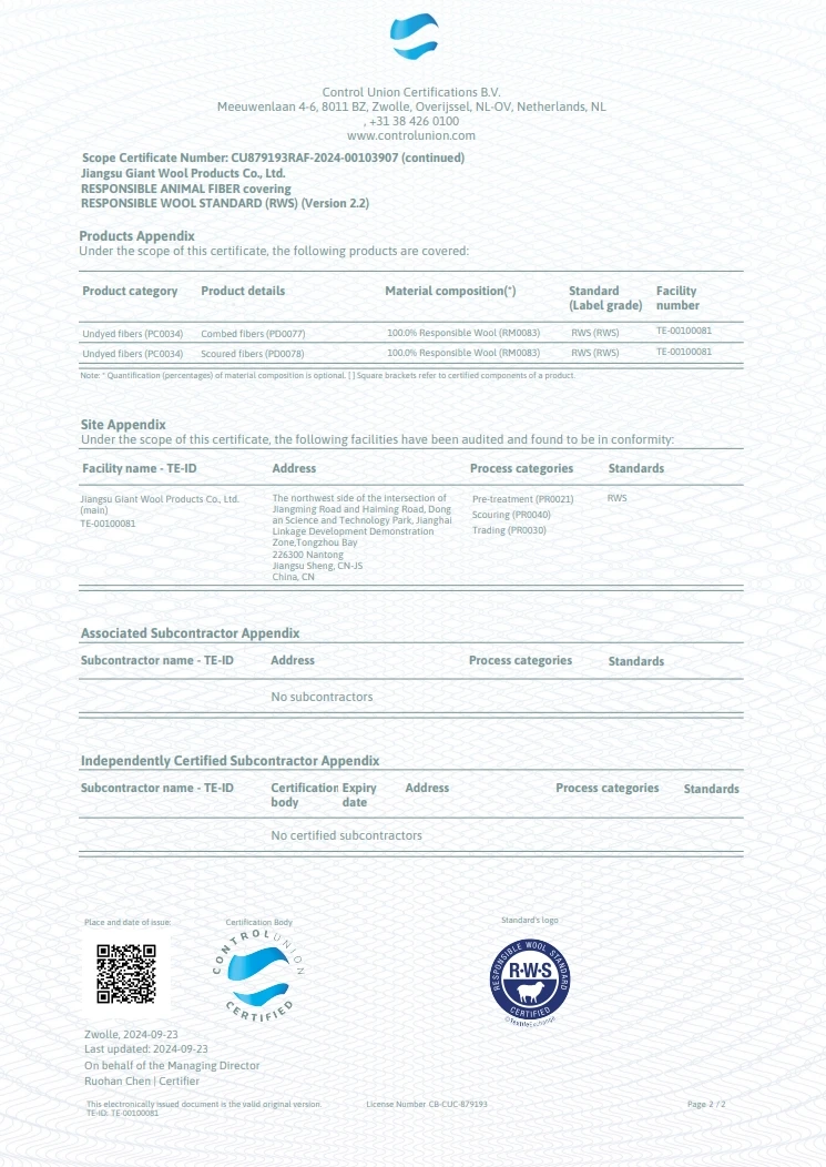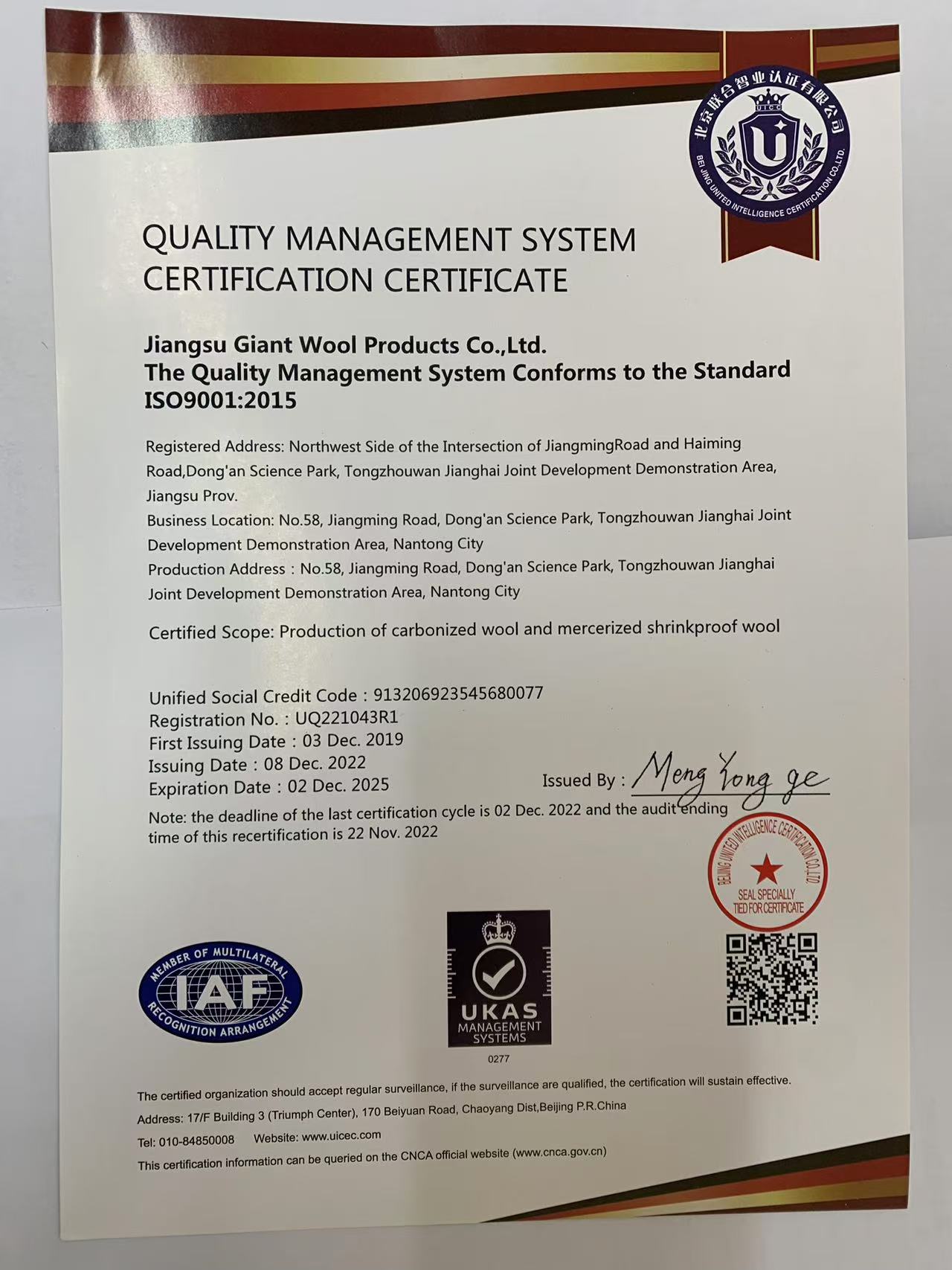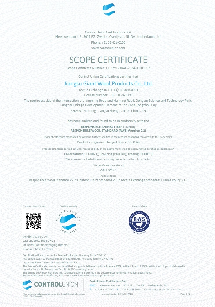 Jiangsu Glant Wool Products Co., Ltd. established on August 31, 2015, is a professional wool textile manufacturer specializing in wool carbonising and loose wool super wash processes. The company is located in the Dong’an Science and Technology Park, Tongzhou Bay Jianghai Joint Development Demonstration Zone, Nantong City, Jiangsu Province, China. They have built modern production facilities spanning over 30,000 square meters. Equipped with advanced production lines, their annual production capacity reaches 10,000 tons of carbonized wool and 3,000 tons of bleached and shrink-proof wool. The company is engaged in the production, processing, and sales of wool products, as well as trade agency and import/export business.